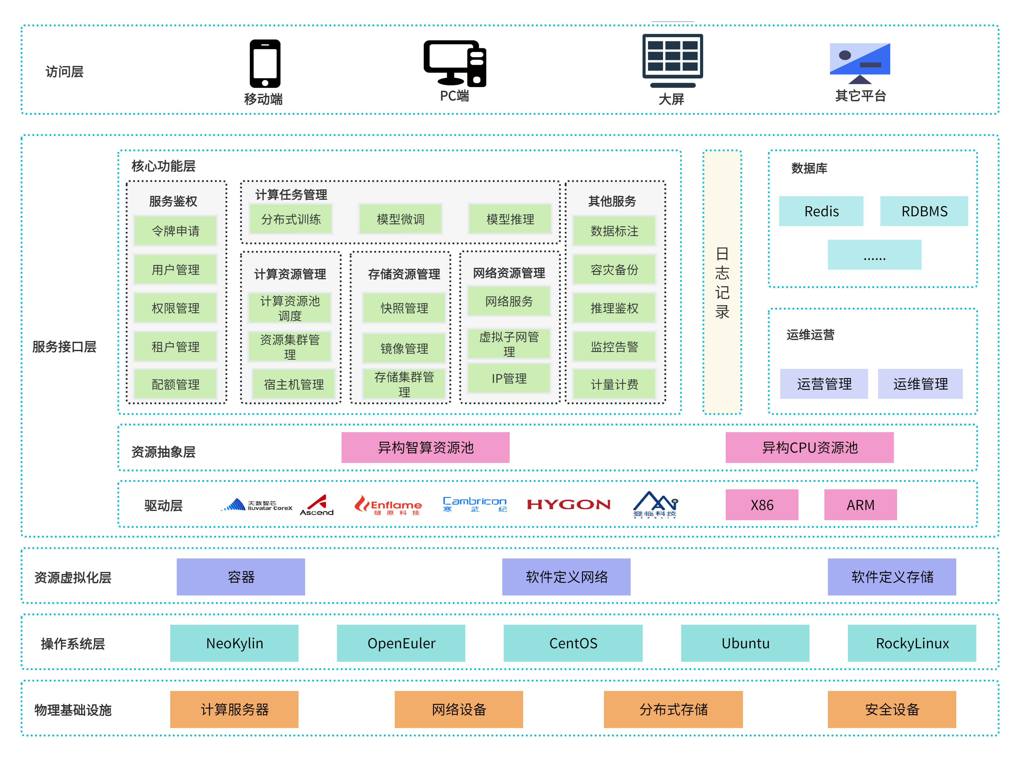 費米集群可作為大模型研發(fā)、具身智能研發(fā)、智能科研創(chuàng)新等前沿領(lǐng)域的底層支撐基座。同時具備智算云基礎(chǔ)設(shè)施基座能力,能夠?qū)崿F(xiàn)跨域異構(gòu)算力資源的協(xié)同調(diào)度與混合訓練任務(wù)的全流程適配,為多場景智能應(yīng)用落地提供底層技術(shù)承載。