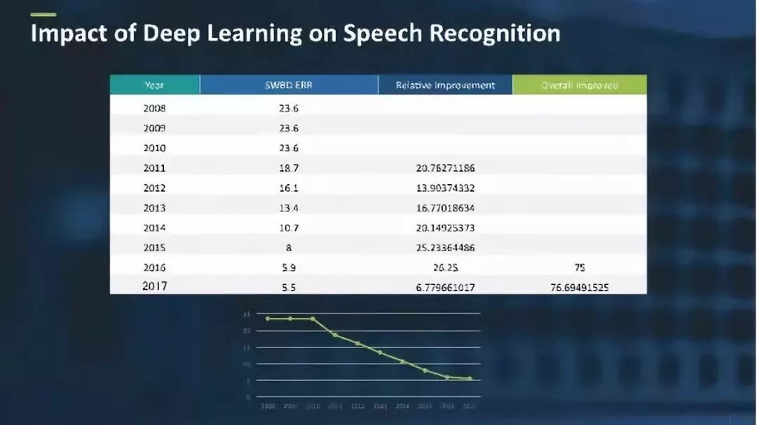 從2008年到2011年,誤字率一直都處于一個(gè)穩(wěn)定的狀態(tài),位于23%至24%之間;而深度學(xué)習(xí)從2011年開(kāi)始出現(xiàn)時(shí)起,誤字率從23.6%降低至5.5%。這一重大發(fā)展對(duì)語(yǔ)音識(shí)別開(kāi)發(fā)而言是一種變革,其誤字率的改進(jìn)相對(duì)提高了近77%。